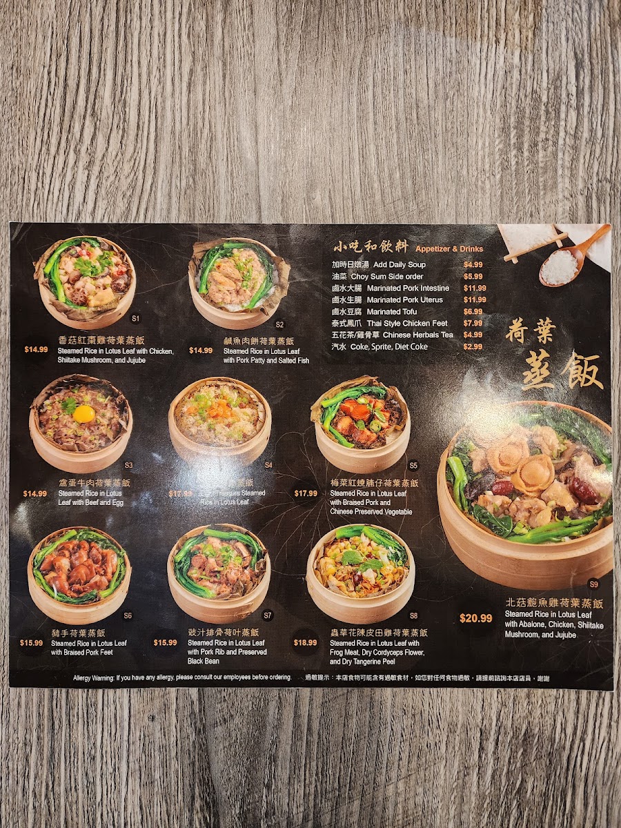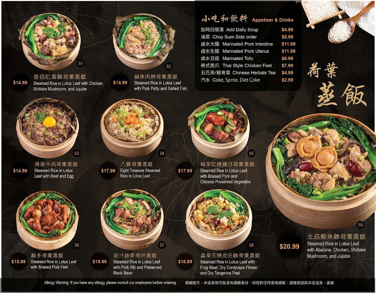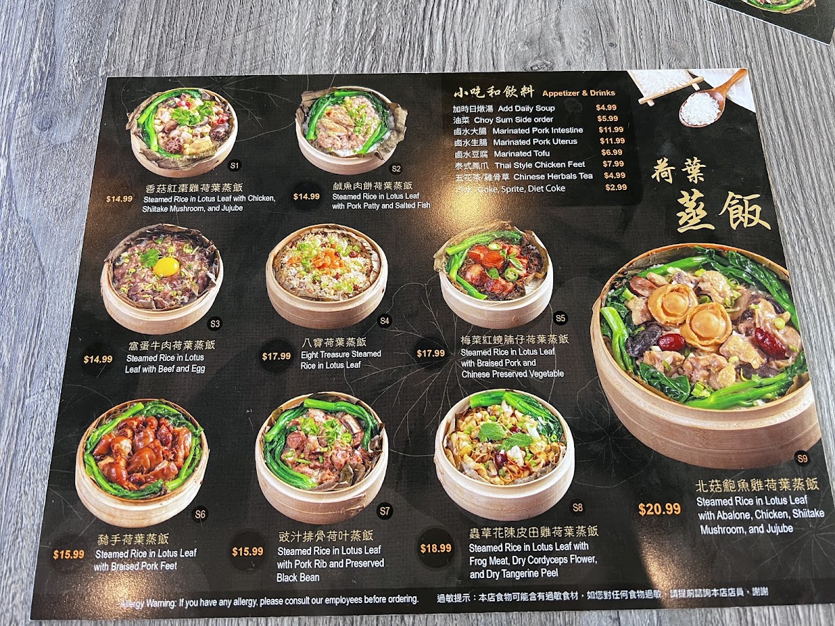 The menu is a treasure trove of flavorful dishes, primarily centered around their specialty—steamed soups and rice in lotus leaves, each brimming with comforting, hearty ingredients. Notably, the Stewed Soup With Abalone, Chicken and Ginseng at $18.99 is a must-try. The abalone adds a delightful chewiness that beautifully pairs with tender chicken, all soaking up the rich, fragrant broth. Another standout is the Stewed Soup With Squab, Chinese Yam, Wolf Berry & American Ginseng, which offers a soulful experience with each spoonful, a blend of delicate flavors that warm the heart on cooler days.