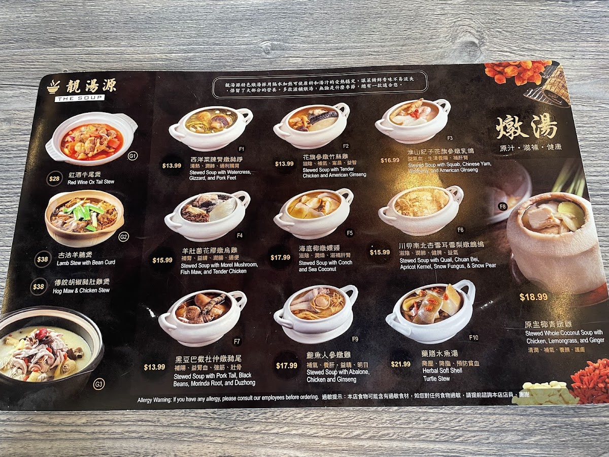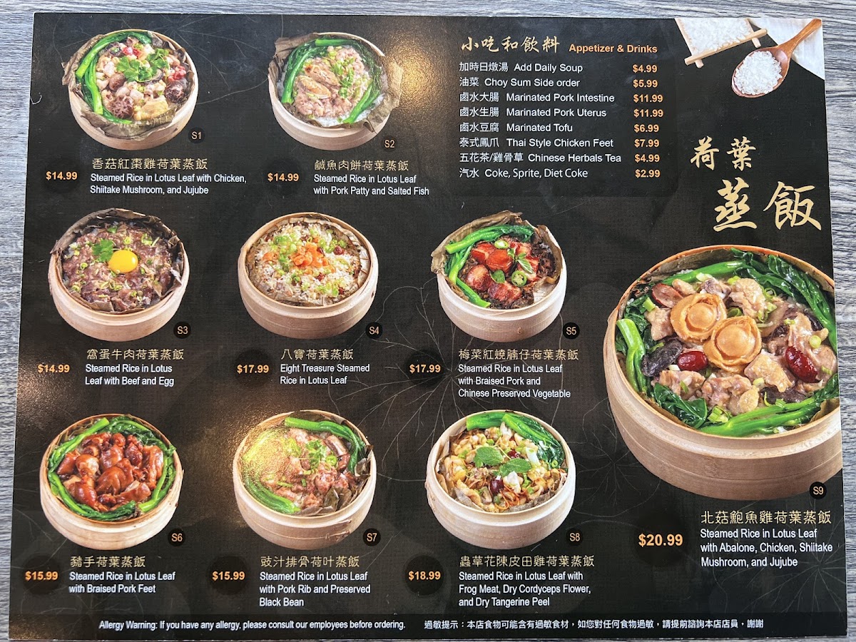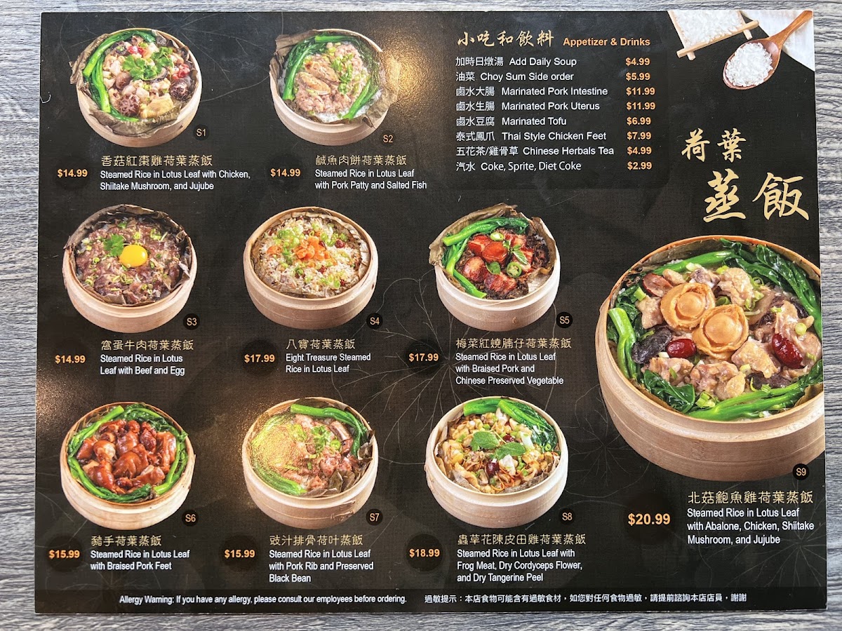The menu is a treasure trove of flavorful dishes, primarily centered around their specialty—steamed soups and rice in lotus leaves, each brimming with comforting, hearty ingredients. Notably, the Stewed Soup With Abalone, Chicken and Ginseng at $18.99 is a must-try. The abalone adds a delightful chewiness that beautifully pairs with tender chicken, all soaking up the rich, fragrant broth. Another standout is the Stewed Soup With Squab, Chinese Yam, Wolf Berry & American Ginseng, which offers a soulful experience with each spoonful, a blend of delicate flavors that warm the heart on cooler days.
